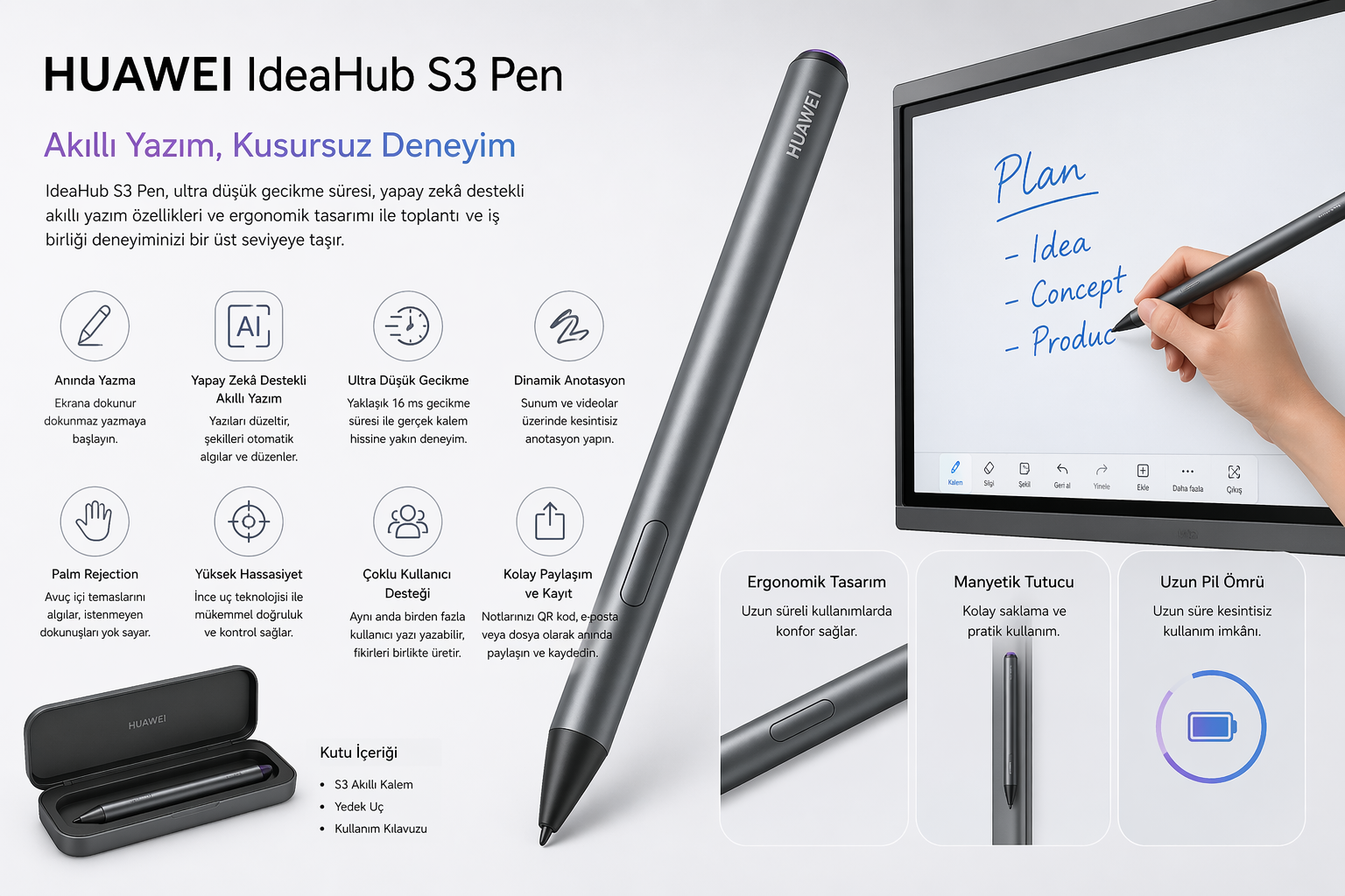 Huawei IdeaHub S3 Pen, IdeaHub S3 serisi ile tam uyumlu olarak çalışan, yeni nesil dijital yazım ve etkileşim aracıdır. Toplantılar, sunumlar ve eğitimler sırasında anlık yazma, çizim ve işaretleme imkânı sunarak iş birliği süreçlerini hızlandırır.